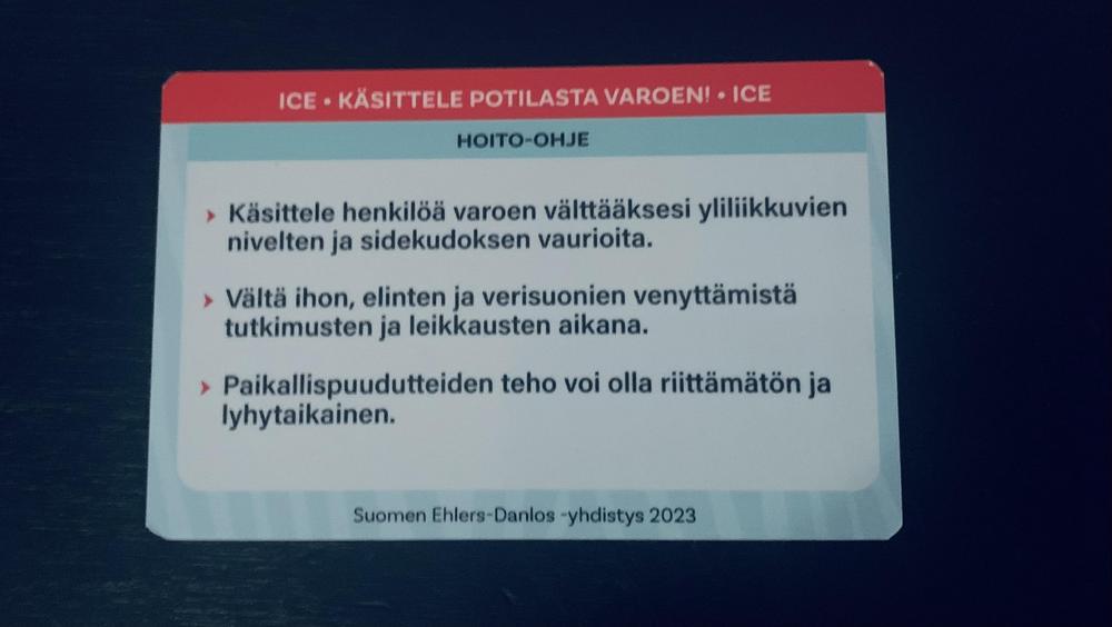 Ensiapukortti on lompakkoon sopiva paketti tietoa siitä miten huomioida yliliikkuvuukirjon oireyhtymät akuuteissa tilanteissa. Ensiapukortin tueksi on työn alla laajempi tietolehtinen, joka voi auttaa erilaisilla lääkärin vastaanotoilla. Tiedotamme lehtisen edistymisestä pian!