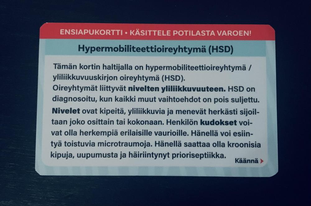 Suomen Ehlers-Danlos -yhdistys on luonut oman ensiapukortin yliliikkuvuuskirjon oireyhtymiä sairastaville. Ensiapukortin tavoitteena on helpottaa kommunikointia hätätilanteissa ja kertomaan pienenä pakettina tärkeimmät tiedot esimerkiksi hoitohenkilökunnalle.